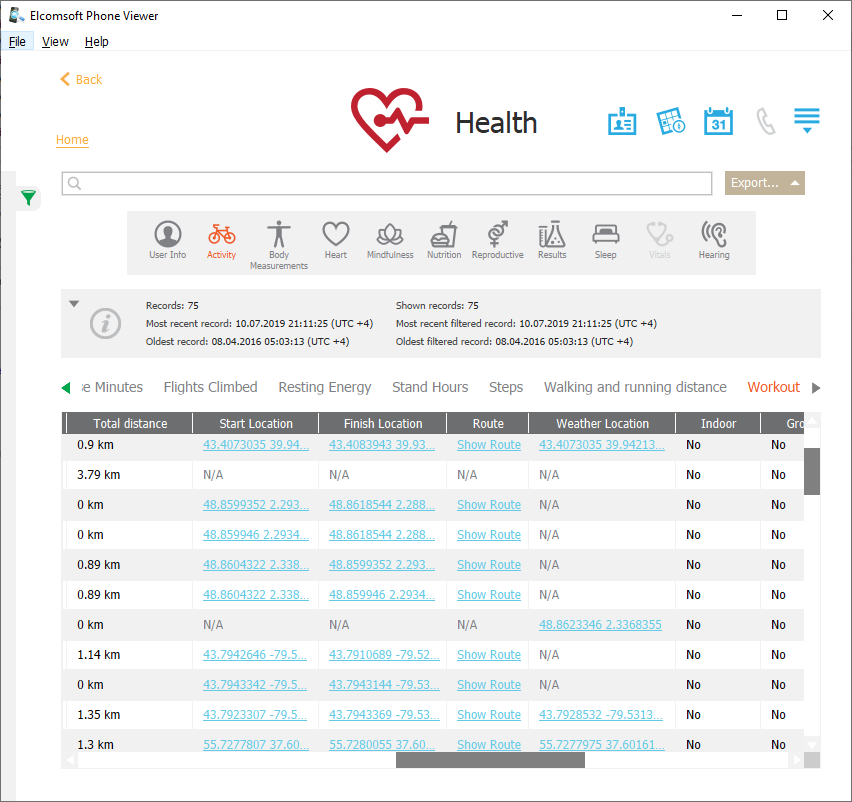 Elcomsoft Phone Viewer can display Health data stored in password-protected iTunes backups and file system images obtained from iOS devices in TAR/ZIP format with Elcomsoft iOS Forensic Toolkit or GrayKey during physical extraction.