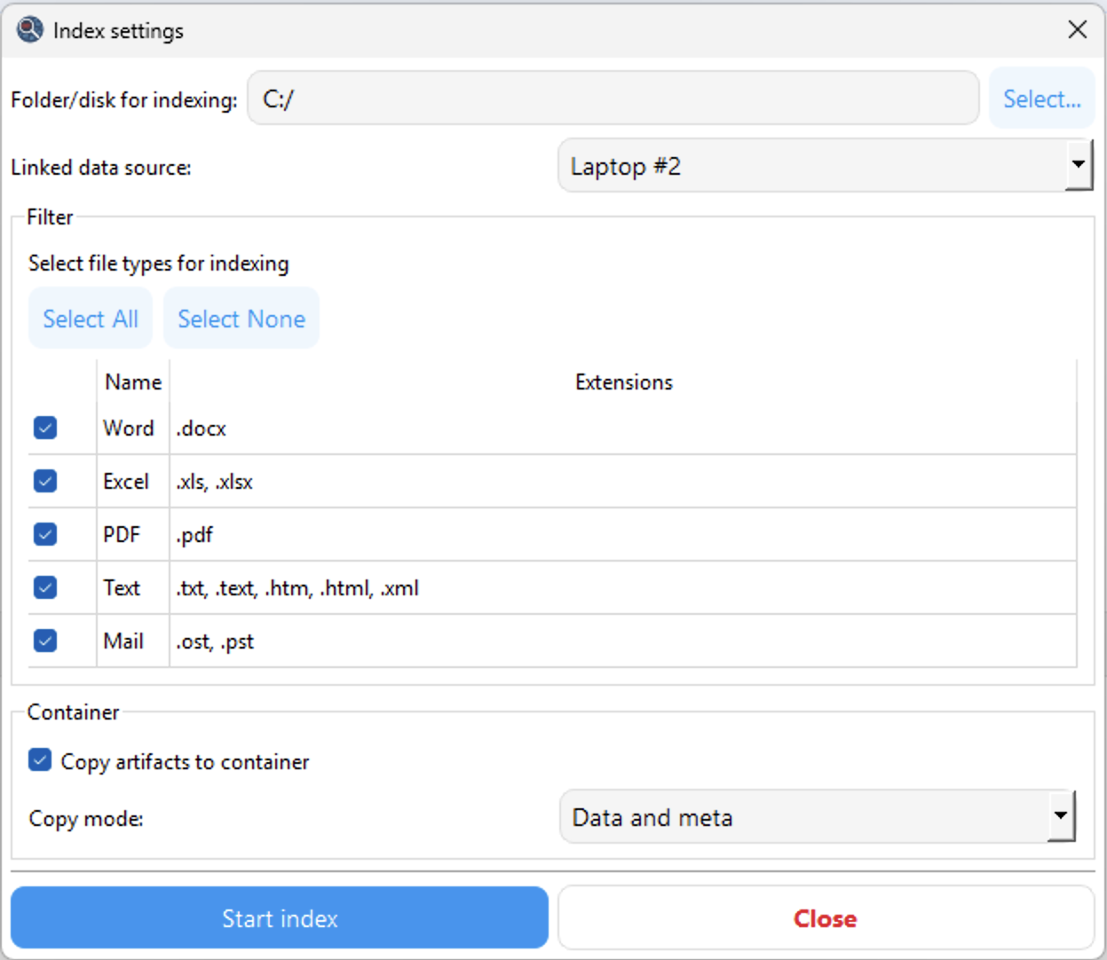 All extracted data is stored in a single container based on the open VHDX format with additional metadata, simplifying storage, transfer, and follow-up analysis.