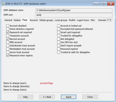 The SAM database editor allows viewing and changing most properties of local user accounts: