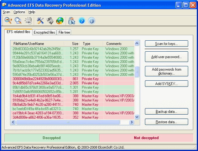 If some keys were not decrypted (i.e. they're red), don't panic. Probably, these keys are not needed at all, and you can go directly to the second step – Scan for encrypted files or Browse for encrypted files. And only if AEFSDR will not be able to decrypt the files you need, return to EFS related files and try to fix the problem as described below.