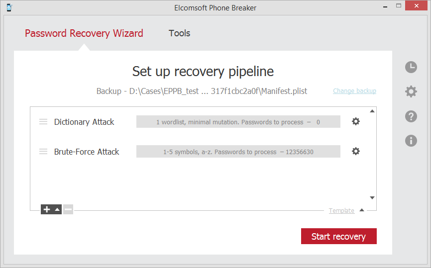 EPB recovers the password to backups and password containers by checking various passwords to see which one matches the backup password. This can be compared to "attacking" the password, so attack is actually a task that is intended to find the correct password. A combination of attacks makes up a recovery pipeline. NOTE: Recovering passwords is available only when using EPB for Windows OS. There are two types of attacks available: ▪Dictionary: The task is based on searching the password in particular dictionaries (the dictionary is a text file, one word per line). You can use third-party password dictionaries, create your own dictionaries, or use the standard one provided by Elcomsoft. ▪Brute-Force: This type of attack allows checking all passwords in a given range by applying different combinations of symbols to see if they match the necessary password.